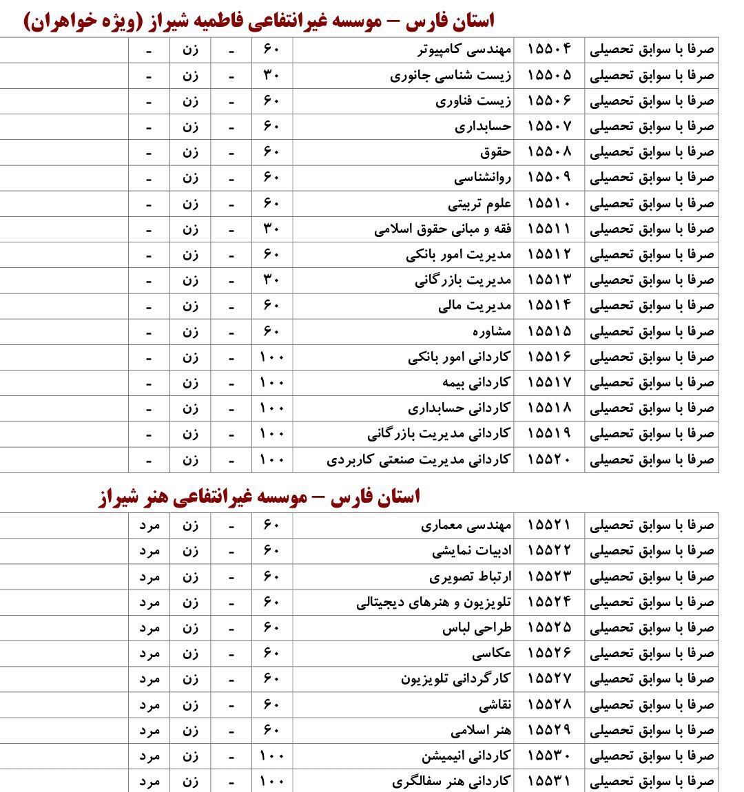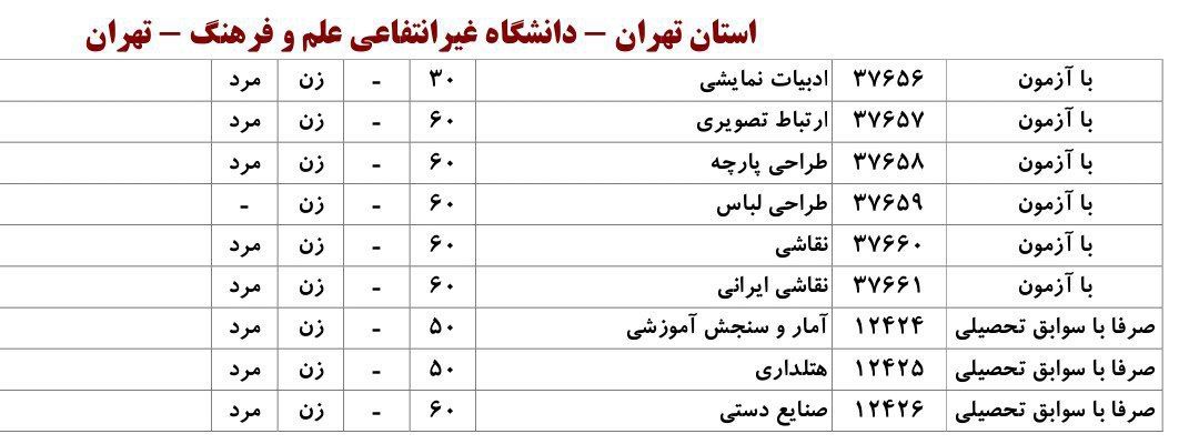 نمایش عروسکی، معماری داخلی، مهندسی شهرسازی، روزنامهنگاری، مدیریت فرهنگی و هنری، ادبیات نمایشی، طراحی صحنه، صنایع دستی، عکاسی، کتابت و نگارگری، نمایش عروسکی، هنر اسلامی